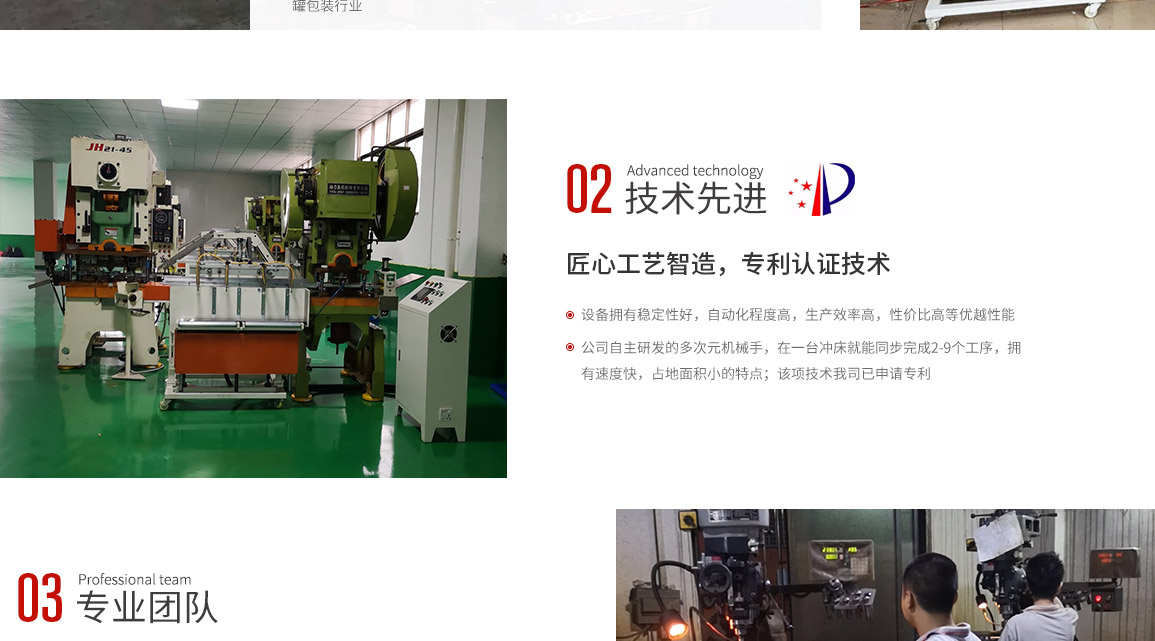 罐身自動扣骨機生產(chǎn):茶葉罐/酒罐/化妝品罐/內(nèi)衣罐等等. 其中多次元機械手專為兩片盒的生產(chǎn)和三片罐的蓋、底、蓋圈、拍底蓋等的生產(chǎn)而設(shè)計,...